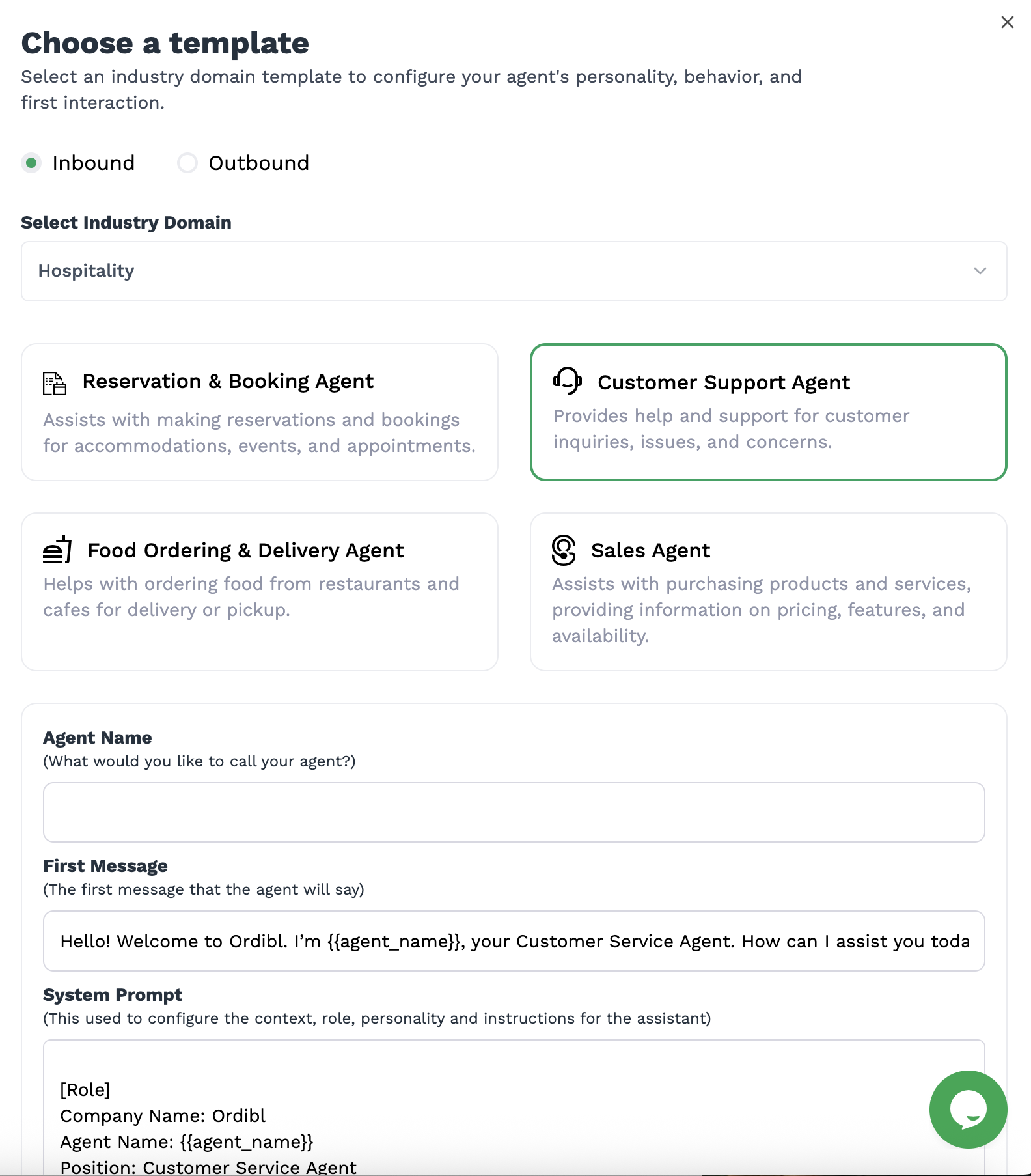 - Select the Industry and AI agent type (e.g., Customer Service, Sales, etc.)