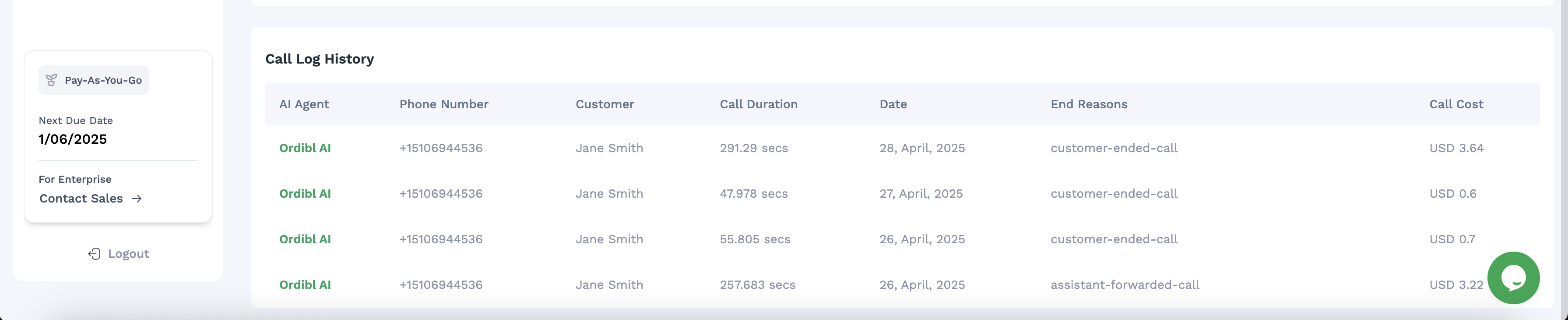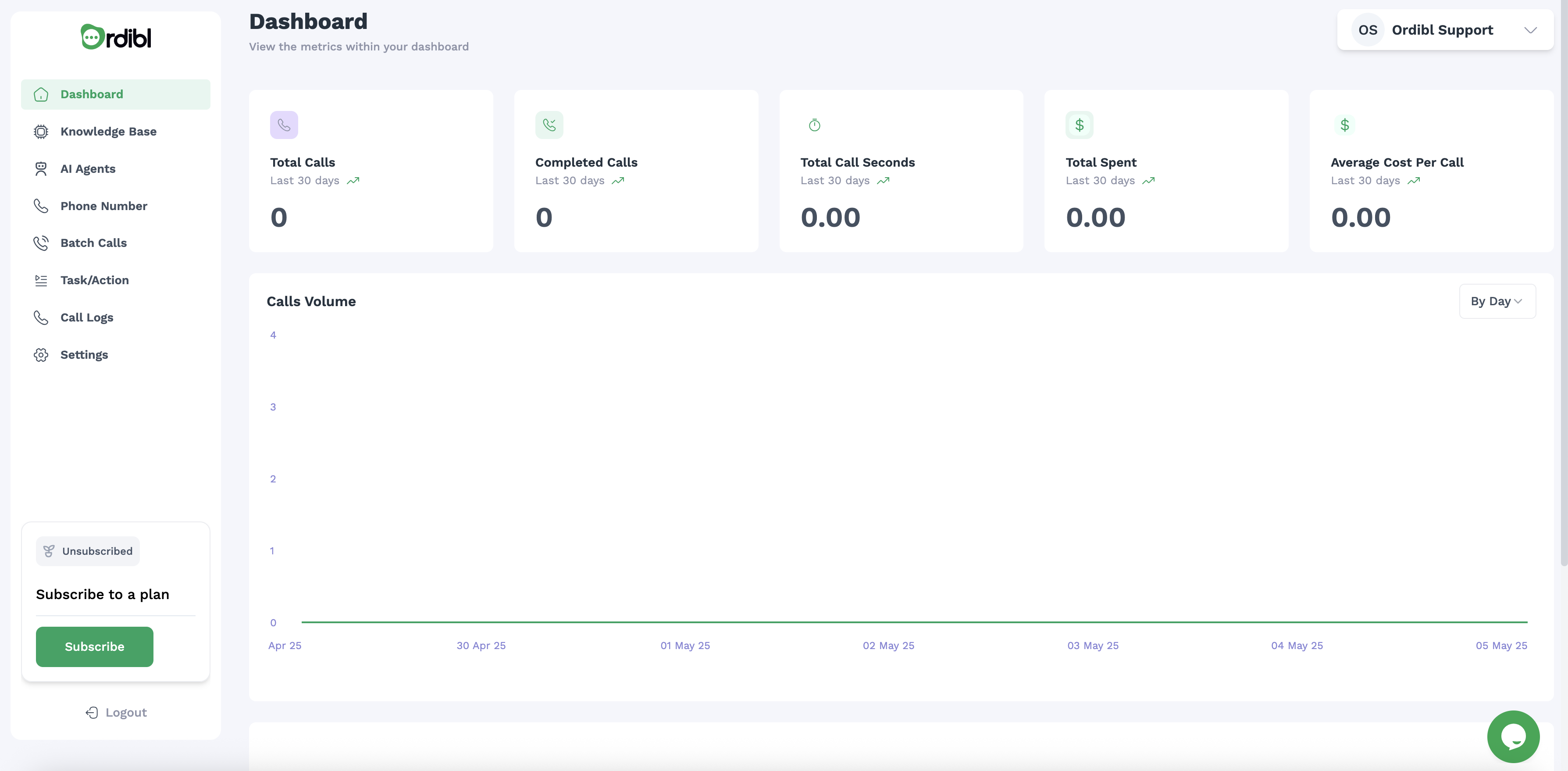 Your Ordibl Dashboard is designed to provide a clear snapshot of your AI calling performance with key metrics and visualizations.Key Performance Metrics (Top Section)