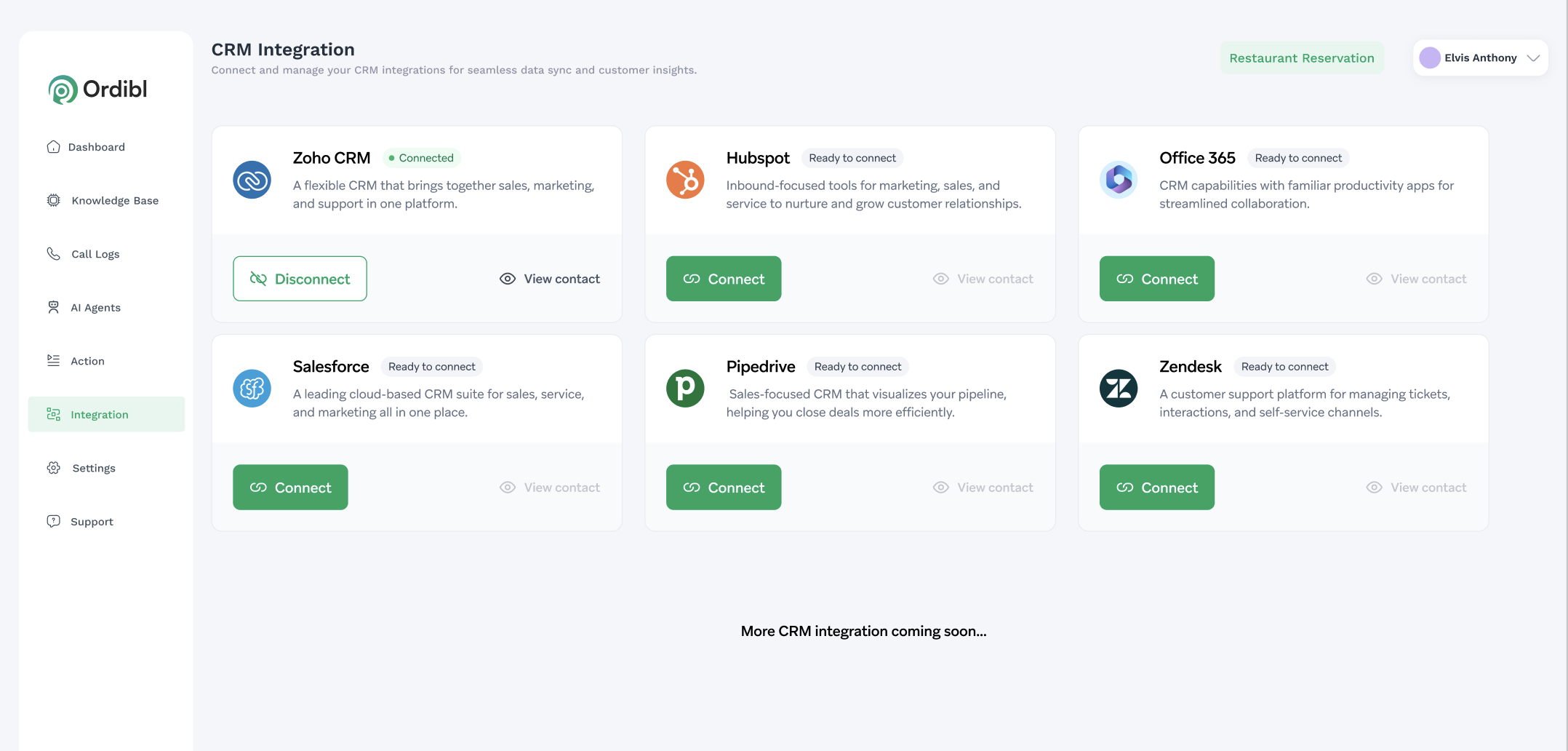 Ordibl currently supports the following CRM platforms:- Zoho CRM - A flexible CRM that brings together sales, marketing, and support in one platform